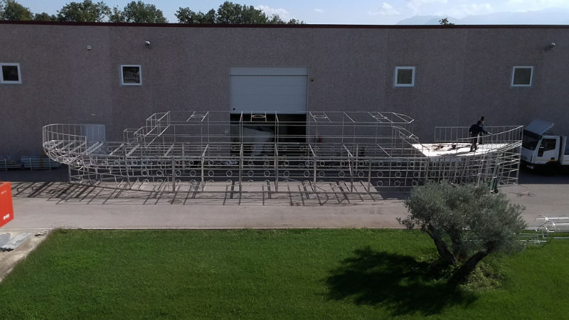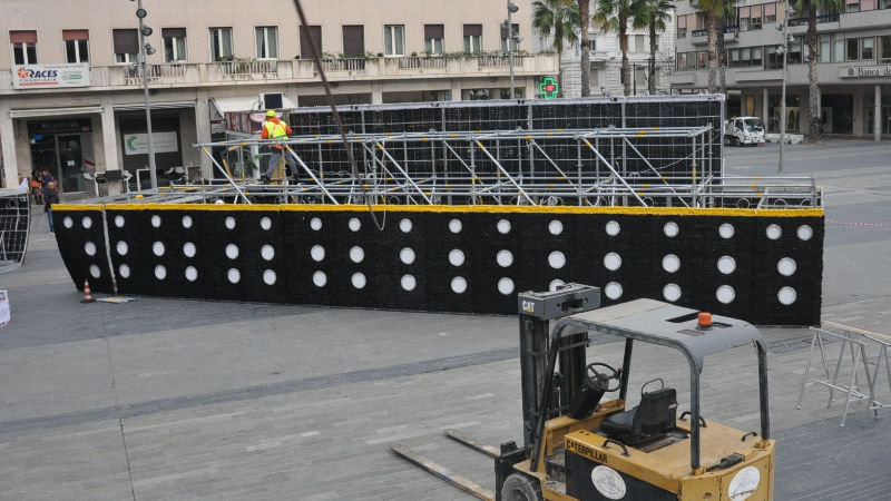 Dopo la messa in opera dello scheletro strutturale, si è proceduto alla suddivisione in parti più gestibili per il trasporto. Le parti sono state quindi trasferite per l’installazione delle luci e la copertura con un tappeto colorato per conferire omogeneità all’opera. Il montaggio delle luci è stato paziente e preciso, garantendo un effetto illuminotecnico particolare.